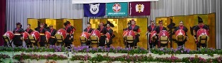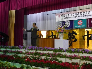 ![]() ▲ 式典前に ムービーショーが行われました。 ▲来賓の皆さまも一緒に校歌斉唱 |