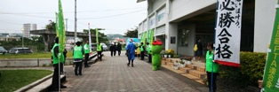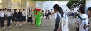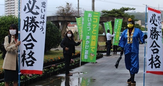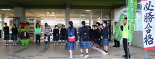 | ●受検に向けての朝の立哨運動が2月26日(金)に行われました。ひとつ歯下駄の天狗さんも参加してくださいました。PTA役員の皆さんが、「おはようございます」の挨拶と共に受験生に向けて必勝のエールを送ってくれました。ありがとうございました。 |