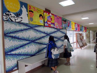 | ●美術室前に掲示されている合唱コンクールのめくりです。どの学級も自分達の歌をPRするべく、作成しました。コンクール本番で活用します。気持ちがこもっていますね。 |