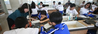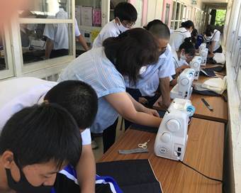 | ●家庭科でのミシンの実習でお母さん方がミシンの補助ボランティアをして下さいました。生徒も安心して、ミシンを使って作品を仕上げていました。先に仕上げた生徒が未だのお友達に教えている場面も見られました。お陰様です。 |