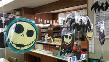 | ●ハロウィンの館内装飾です。時節の行事を意識して、飾り付けをしています。本のコーナーには、怖いお話のシリーズが並べてありました。図書委員さんの思いが伝わってきますね。 |