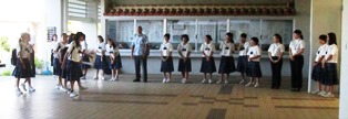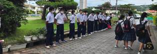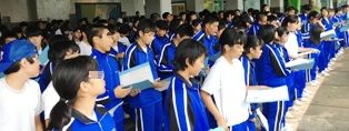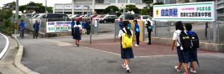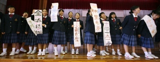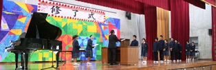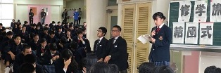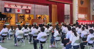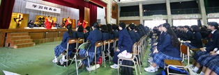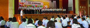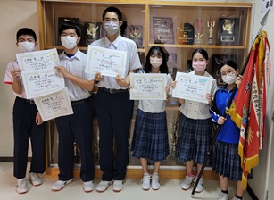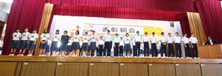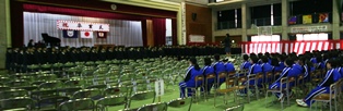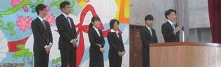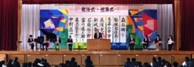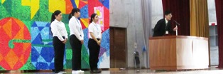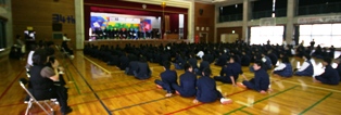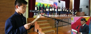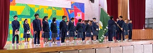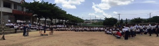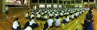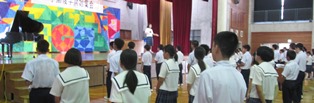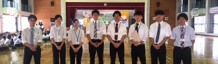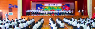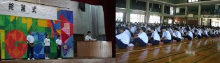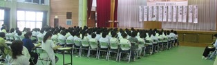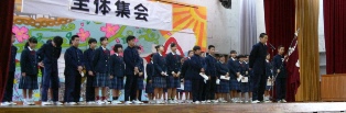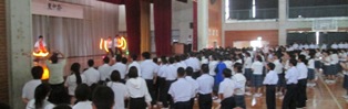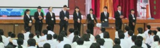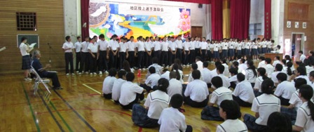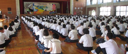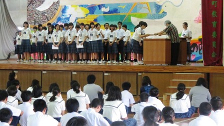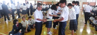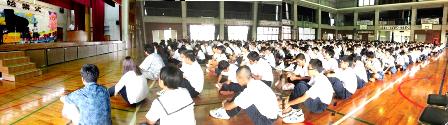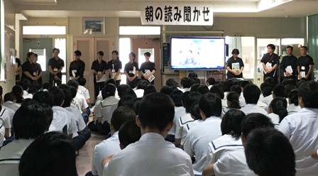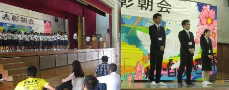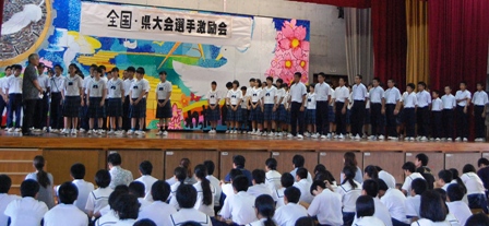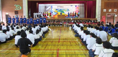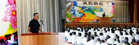 ●表彰朝会が行われました。漢字検定準二級5名はじめ全国大会や九州大会で健闘した各部が表彰されました。また、同時に琉大、沖国大からの教育実習生3人の自己紹介もありました。 →関連