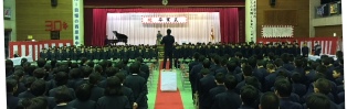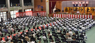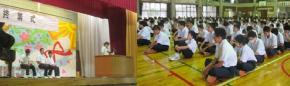 ●中体連地区大会を前に、選手激励会が行われました。吹奏楽部の演奏と応援団の手拍子に合わせて堂々と選手団が入場。各部のキャプテンが意気込みを発表しました。校長先生の激励のことば、先生方による応援演技も行われました。