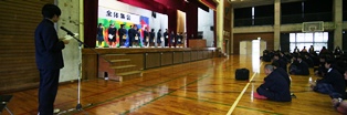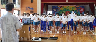 ●全体朝会で、この夏の全国・県大会に出場する選手激励会が行われ、校長先生の激励がありました。卓球部の奥田主将は「最後の一球まであきらめない」と決意を述べました。