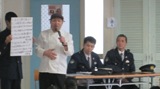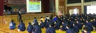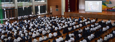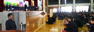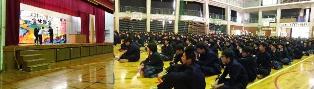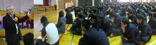 ●1学年ホールで少年犯罪防止講話が行われました。1学年の生徒は県警本部生活安全部少年課の新垣和哉さんの話を真剣に聞いていました。