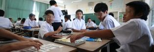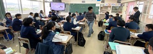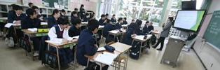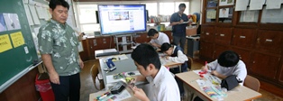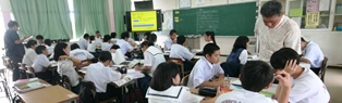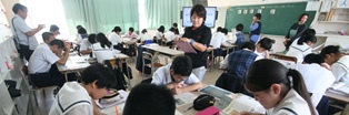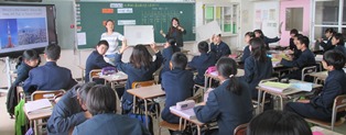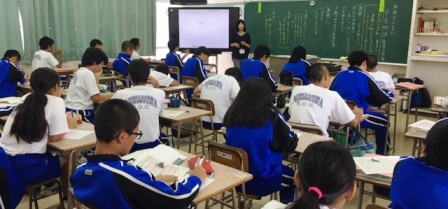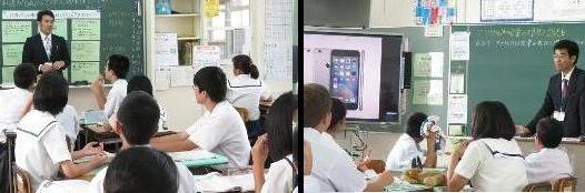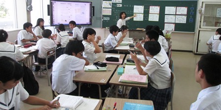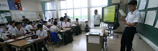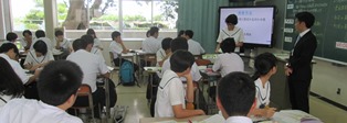 ●教育実習生2人の研究授業が行われました。與那城先生は3年1組で公民、上原一哲先生は1年5組で社会。生徒たちは電子黒板を駆使した授業に熱心に参加していました。 →関連