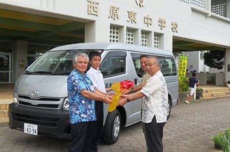 ●新しい学校車が納車されました。夏季大会に間に合うようにと創立30周年記念事業実行委員会会長・副会長さんから校長先生・生徒会長さんへ、黄金のキーとともに。創立30周年記念事業の一環です。ありがとうございました。