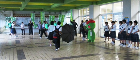 ●町P連の皆さまによる「ニコッと笑顔であいさつ声かけ運動」が行われました。さわりんもハイタッチでお出迎え。激しい雨も何のその、さわやかな朝になりました。