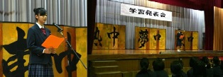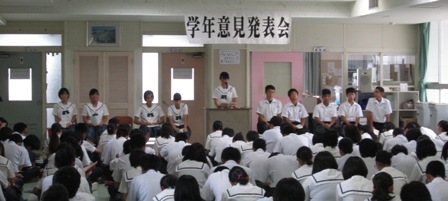 ●各学年のフロアーで学年意見発表会が行われ、各学級代表の男女1名(学年で10名、全校で30名)がそれぞれ、意見を力強く、真剣に発表しました。優秀賞男女各1名は、10月4日の西原町意見発表大会に出場します。結果は後日。