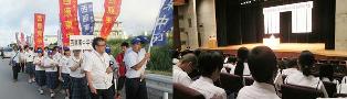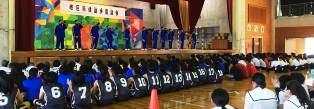 ●地区陸上の選手激励会が行われ、キャプテンの安藤さん・知念さんの力強い決意表明や生徒会の激励メッセージ、校長先生の励ましの言葉で、全生徒が団結して応援することを決意しました。