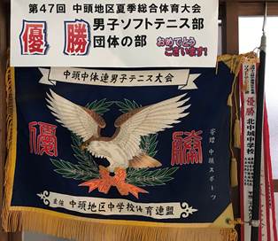 | ●第47回中頭地区総体ソフトテニス大会で団体優勝!! 7月23日・24日桑江中テニスコートにて。個人戦は5位。短い期間での練習の成果を出せたことに拍手〜素晴らしい!!優勝旗がまた戻ってきました。 |