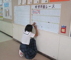 ★生徒会による給食準備レースが始まりました。どの学級が準備が早いかな。(3学年の取り組みです)