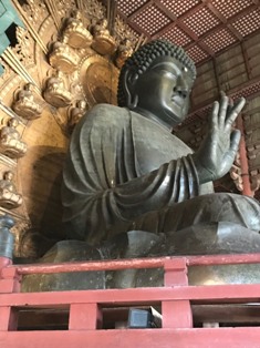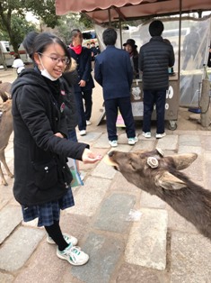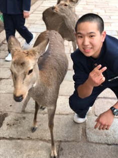 奈良公園の鹿は特別に大切にされていきているという話や、接し方の注意などを聞いて、鹿と楽しく優しくふれあうことができた。思っていたより多く大きかったので驚いた。せんべいを持っていると周りにたくさん集まってきた。味は大豆みたいな味がした。ものすごく大きな木造の2階建ての建物の中に、金色のものすごく大きな仏像があって圧倒された。手のしわや背後の飾りも細かくつくられてきれいだった。(2年1組 上地真斗) |