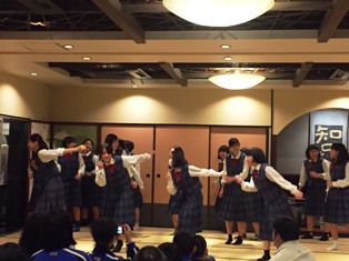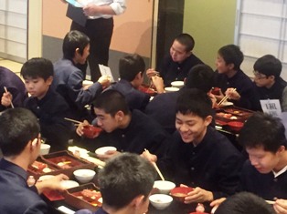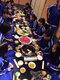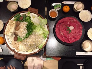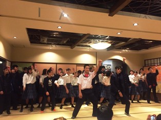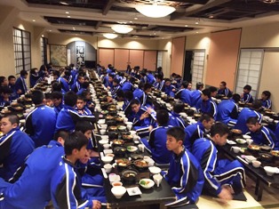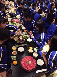 | ・18:00 夕食 | ・食後はお楽しみ「レク大会」19:45予定です。 ・大広間での夕食。メニューは豪華、すき焼きです。 ・自主研修全員無事に、笑顔、元気いっぱいで帰還し、入浴を済ませました。 |