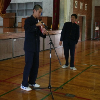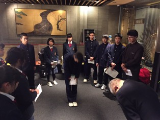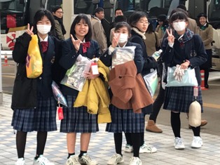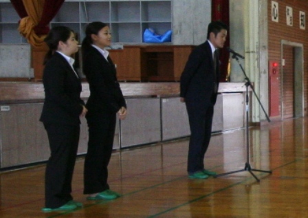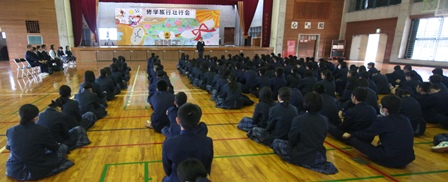 | 1月21日(月) | ・学校 荷物検査・壮行会 | ・体育館で荷物検査を行いました。そのあと、壮行会があり、伊波校長先生の団長あいさつ、西原睦貴さんの生徒代表あいさつ、日本旅行社の宮里竜輔さんの添乗員紹介、二宮教頭先生の激励のあいさつ、2学年PTA委員長の大城愛美さんのあいさつがあり、みんなで、目的達成と安全を誓いました。 また、3年生の安田秀吉さんから、奉納してと3年生の高校合格祈願の絵馬が渡されました。 |