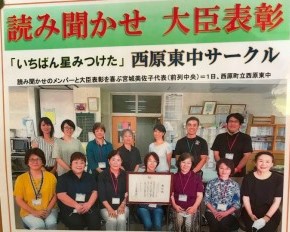 | ●朝の読み聞かせをして下さっている「いちばん星みつけた」の皆さんが文部大臣賞を受賞しました。日頃の活動を評価されての受賞です。おめでとうございます。お忙しい中、子ども達のために、いつもありがとうございます。今後も宜しくお願いします。 |   読み聞かせ 文部大臣賞受賞!!