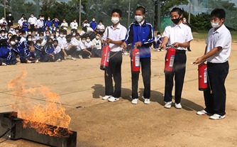| ● 10月26日(月)に火災避難訓練を実施しました。整然とした移動、整列に東部消防職員からお褒めの言葉を頂きました。実際に消化器を使用して訓練も行いました。いざという時も訓練の時のように行動したいですね。 |   火災避難訓練で実演しました。