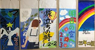 | ●いつの間にか学級旗ができあがっています。似通ったデザインが無く、面白い視点から描かれている物もあり、各々の学級の個性がにじみ出ています。生徒が着実に動いています。 |  学級旗が出来上がりました。