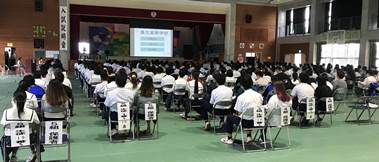 |   始業式で真剣に発表者の話を聞く本校の生徒たち